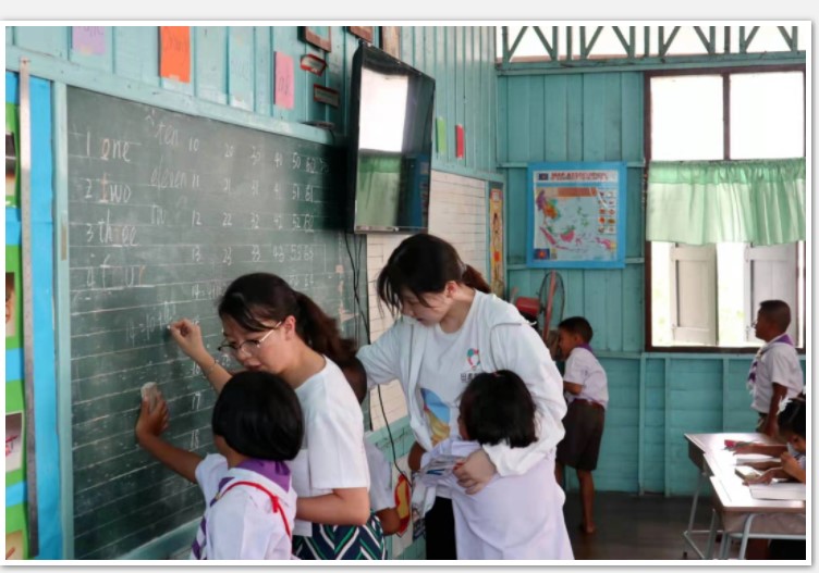 谭惠心(左二)在支教活动中与学生交流