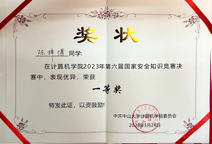 为贯彻落实习近平总书记关于总体国家安全观的重要指示精神,提高全民国家安全意识,营造维护国家安全的浓厚氛围,增强防范和抵御安全风险能力,计算机学院联合保密管理办公室、党委保卫部、保卫处、先进技术研究院和小谷围派出所举办第六届国家安全知识竞赛。我系多名同学参加比赛。最终,2021级本科生陈梓博同学荣获竞赛一等奖。