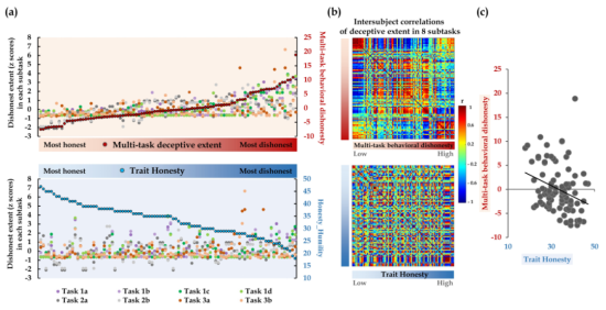 该研究发现在不同任务中,说谎者比率以及说谎次数/程度变化较大,呈现欺骗决策跨情境的多变性。此外,在相同类型的实验范式内,不诚实程度的一致性较高,但差距较大的实验范式之间的不诚实程度的一致性较低。因此,研究结果可能说明从单一环境中得出的结论可能可以较好地推广到类似情境,但可能不适用于截然不同的情境。此外,研究还观察到诚实特质与子任务中欺骗程度的相关性较弱或不显著,这表明个体在特定情境下的欺骗行为与他们的诚实特质存在较大偏差。相比之下,通过整合多个子任务所得出的多任务行为不诚实指标,能够更全面地描述个体行为不诚实的水平,缓解由单一观察所带来的偏差问题(图1)。